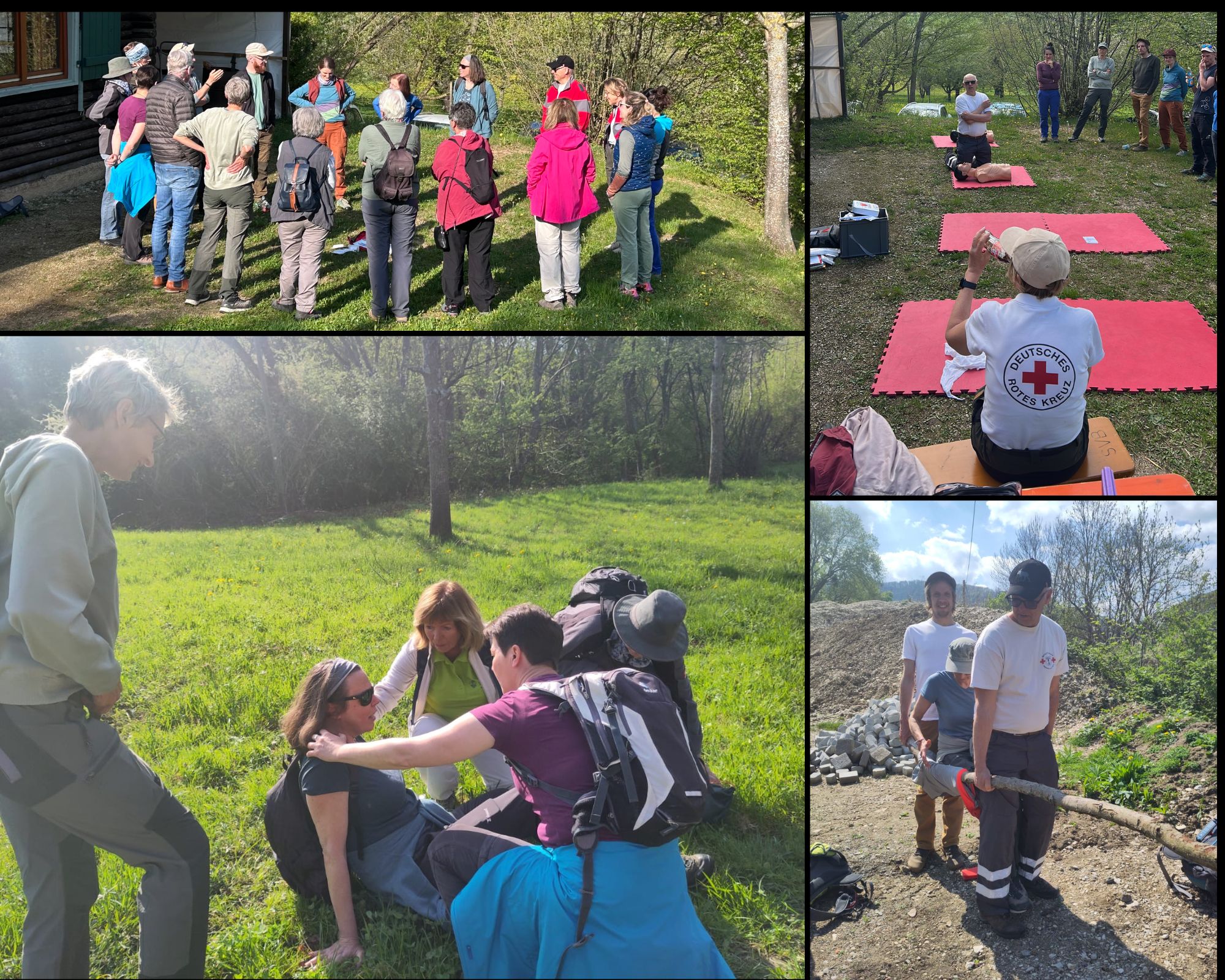 Am Samstag waren wir WanderführerInnen zum Outdoor 1. Hilfe Kurs in der Bissinger Eichhalde unterwegs. “Learning by Doing“ war die Devise und so packten wir erstmal allerlei Erste Hilfe Material in unsere Rucksäcke und dann gings auch schon los. Auf unserer Strecke fanden wir so manch leicht oder auch schwer Verletzten, der schnellstens versorgt werden musste. Es war erstmal herauszufinden, was passiert ist und wie am besten gehandelt wird. Das Wetter, das Gelände, die Netzverbindung und der angebliche Anfahrtsweg der professionellen Rettungskräfte versetzte die Helfenden dazu noch mehr unter Stress. Zuerst war das schauspielerische Können der einzelnen Teilnehmer gefragt, um die Notfallsituationen so real wie möglich erscheinen zu lassen. Die Helfenden mussten manchmal sehr kreative Ideen entwickeln, um die jeweilige Situationen zu meistern. Es war sehr interessant, die unterschiedlichen Rollen zu erleben – als Patient – als Helfer – als Leitstelle oder nur als Beobachter. Von jeder Erfahrung konnte man profitieren. Frank und Monika Schober vom Roten Kreuz haben die Fälle mit uns reflektiert und uns viele Tipps gegeben. Die bunt gemischte Gruppe hat an diesem ereignisreichen Tag nicht nur sehr viel gelernt, sondern auch sehr viel gelacht.